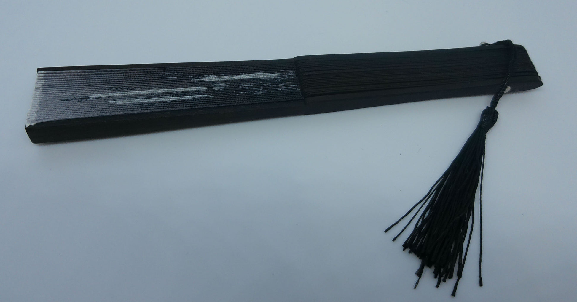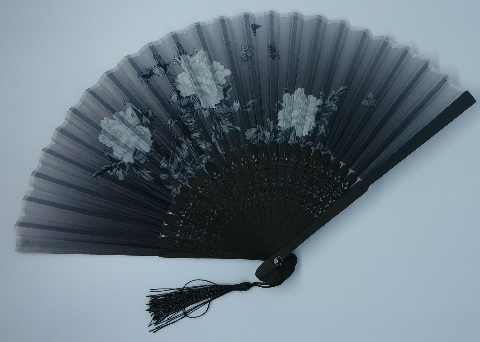 Magnifique éventail noir aux fleurs blanches avec pompon