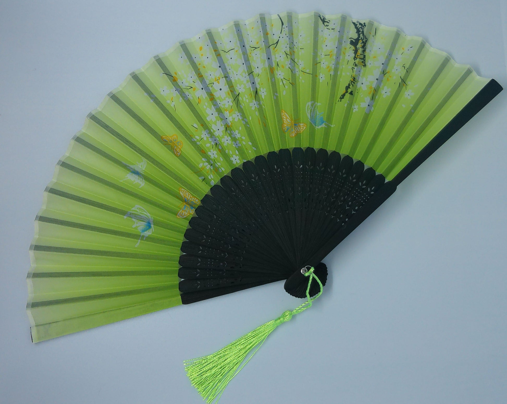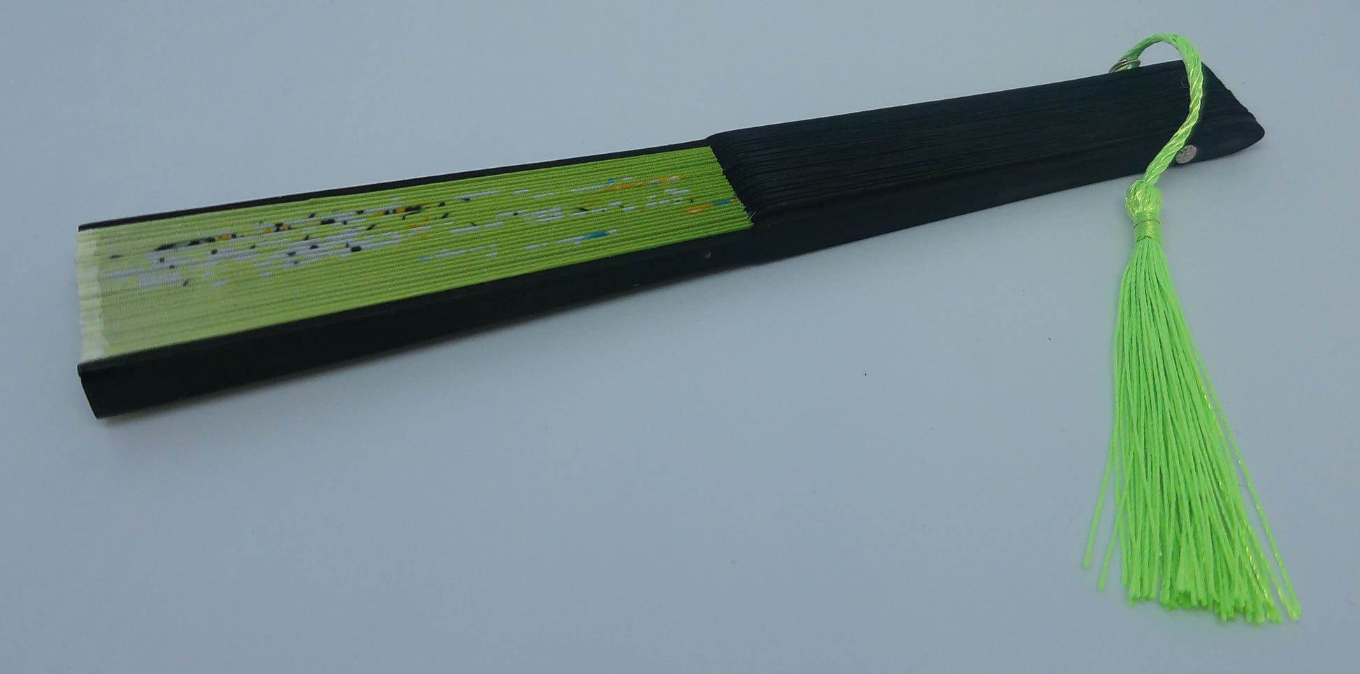 Magnifique éventail vert et noir aux motifs fleuris avec pompon.